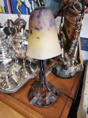 Jolie lampe époque Art Nouveau Art déco 1910 1930 tulipe pâte de verre pied en fer forgé à décor végétal