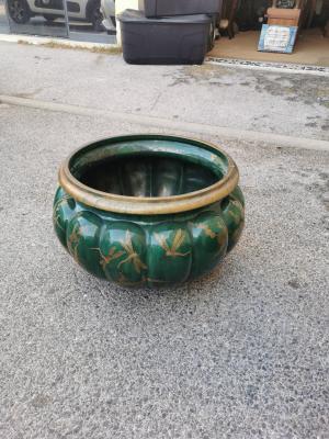 Barbotine debut 20e très grande jardinière cache pot art nouveau a décor de chardons et de libellule # dlg école de nancy, gallé daum muller schneider pate de verre verrerie